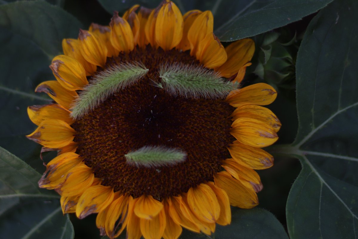 ちょっとヒマワリが笑ってる顔!これ、猫じゃらしを目と口にしてみた!なんかでも、顔に見えないんだよね…なんか違うものに見えるw